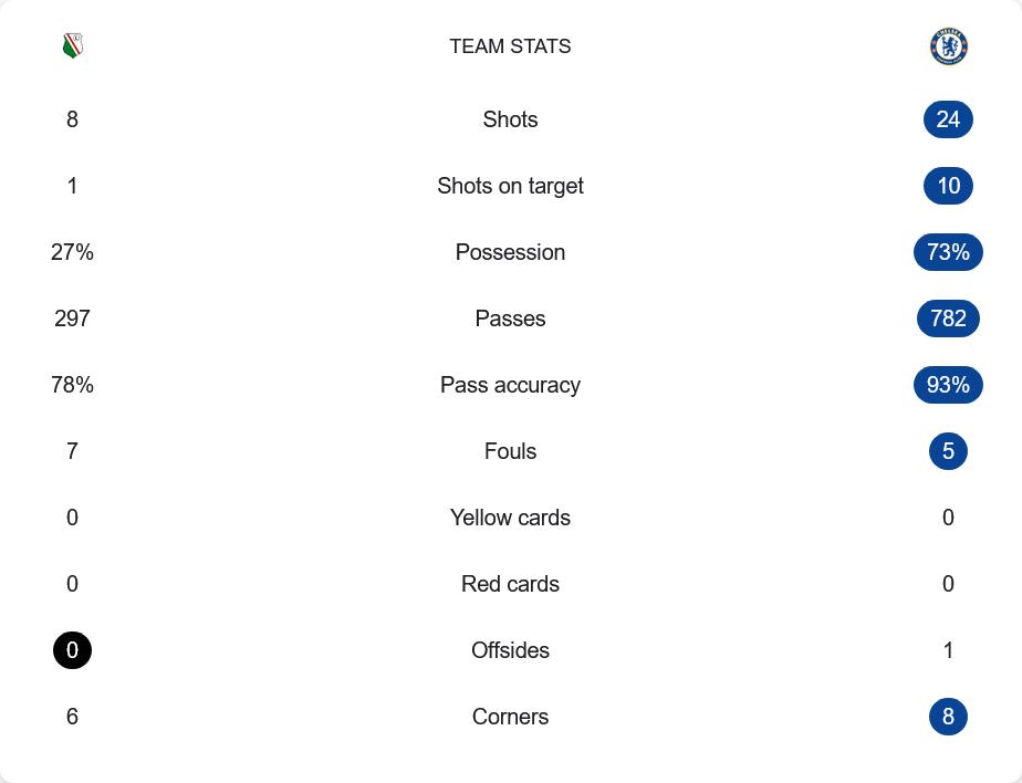 เชลซีเหนือกว่าทุกด้านอย่างชัดเจน โดยครองบอลไปถึง 73% เทียบกับเจ้าถิ่นที่มีเพียง 27% เท่านั้น การผ่านบอลของเชลซีก็ยอดเยี่ยมสุด ๆ ที่ 782 ครั้ง ความแม่นยำสูงถึง 93% ขณะที่ลีเกียผ่านบอลแค่ 297 ครั้ง และแม่นยำเพียง 78% เท่านั้น เชลซีมีโอกาสยิงถึง 24 ครั้ง เข้ากรอบ 10 ส่วน ลีเกียได้ยิงเพียง 8 ครั้ง เข้ากรอบแค่ลูกเดียว เตะมุมก็เป็นของเชลซีที่ทำได้มากกว่า 8 ต่อ 6 การฟาวล์ถือว่าสูสีกันที่ 5 ต่อ 7 แต่ทั้งสองทีมไม่มีใบเหลืองหรือใบแดงในเกมนี้