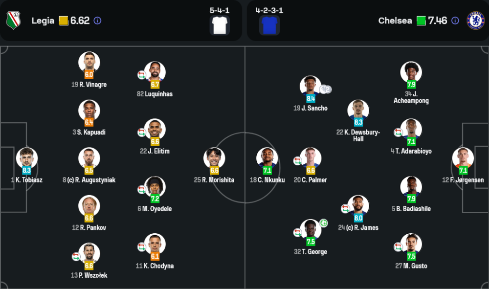 ลีเกีย วอร์ซอว์ ยืนระบบ 5-4-1 ที่เน้นแพ็กเกมรับให้แน่นและอาศัยความเร็วของ ลูคินญาส ในการสวนกลับ แต่บอลไปไม่ถึงแนวหน้าเลยเพราะโดนตัดขาดตั้งแต่แดนกลาง เกมรับแม้จะยันได้ดีในครึ่งแรก แต่พอเจอเกมรุกสไตล์เจาะลึกของเชลซีประกอบกับความอ่อนล้าทางแท็คติก ทำให้แนวรับเริ่มหลุดและเสียประตูแบบรัว ๆ