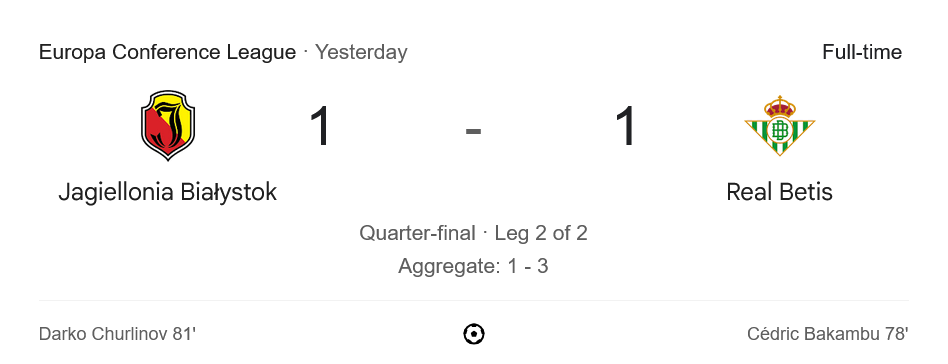 ผลเสมอ 1-1 นัดนี้ทำให้ เรอัล เบติส ผ่านเข้าสู่รอบรองชนะเลิศยูฟ่ายูโรปาคอนเฟอเรนซ์ลีก 2025 ด้วยสกอร์รวม 3-1 โดยจะไปพบกับอีกหนึ่งยอดทีมที่กำลังลุ้นแชมป์ ในขณะที่จาเกียลโลเนีย เบียลีสต็อก จบเส้นทางฝันในฤดูกาลนี้อย่างกล้าหาญ
