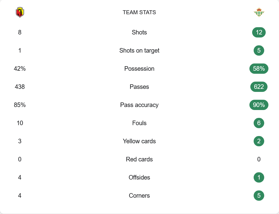 เบติสครองเกมเหนือกว่าอย่างชัดเจน ทั้งจำนวนการยิงที่มากกว่าถึง 12 ต่อ 8 ครั้ง และมีโอกาสยิงเข้ากรอบ 5 ต่อ 1 ครั้ง พวกเขาครองบอล 58% และผ่านบอลแม่นยำถึง 90% เทียบกับจาเกียลโลเนียที่มีเปอร์เซ็นต์ผ่านบอลอยู่ที่ 85% ฟาวล์น้อยกว่า (6 ต่อ 10 ครั้ง) และเสียใบเหลืองน้อยกว่าด้วย (2 ต่อ 3 ใบ) ชี้ให้เห็นถึงความเหนือชั้นของเบติสตลอดทั้งเกม