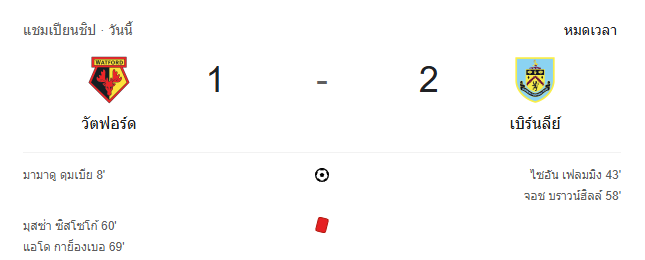 - จบการแข่งขัน: เบิร์นลี่ย์บุกมาคว้าชัยสุดมันส์ 2-1 พร้อมเก็บสามแต้มสุดสำคัญกลับบ้าน