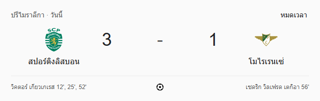 เกมนี้ ผลบอลสด สะท้อนฟอร์มอันยอดเยี่ยมของ สปอร์ติ้ง ลิสบอน ที่จัดการเกมได้อยู่หมัดตั้งแต่นาทีแรกจนจบเกม โดยมี วิคเตอร์ เกียอาเกรส เป็นตัวแปรสำคัญทำแฮตทริกสุดโหด แม้โมไรเรนเซ่จะตีไข่แตกได้ในครึ่งหลัง แต่ก็สายเกินไปในการหยุดเครื่องจักรสีเขียวจากลิสบอนแล้ว!