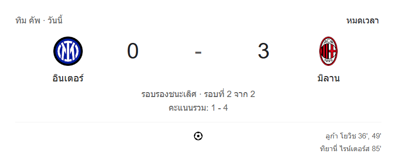 - จบเกม! อินเตอร์ มิลาน 0-3 เอซี มิลาน รวมสองนัดปีศาจแดงดำเข้าชิงด้วยสกอร์รวม 4-1