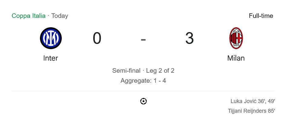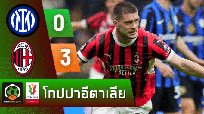 ศึกแห่งศักดิ์ศรีในรายการโกปปา อีตาเลีย รอบรองชนะเลิศ นัดที่สอง คืนวันที่ 24 เมษายน 2568 กลายเป็นค่ำคืนที่ “ปีศาจแดงดำ” เอซี มิลาน จารึกความยิ่งใหญ่ ด้วยการบุกถล่ม “งูใหญ่” อินเตอร์ มิลาน ถึงถิ่น จูเซ็ปเป้ เมอัซซ่า แบบหมดรูป 3-0 ทำให้รวมผลสองนัด มิลานผ่านเข้าสู่รอบชิงชนะเลิศด้วยสกอร์รวม 4-1 อย่างสง่างาม ท่ามกลางบรรยากาศสุดเดือดที่แฟนบอลทั่วโลกติดตาม ผลบอลสด อย่างลุ้นระทึก