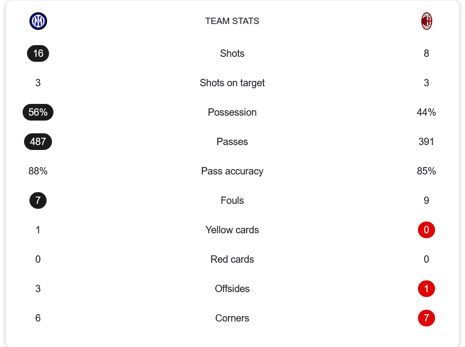 แม้อินเตอร์จะครองบอลได้ 56% และจ่ายบอลมากกว่าที่ 487 ครั้ง เทียบกับมิลานที่มีเพียง 44% และ 391 ครั้ง แต่ประสิทธิภาพกลับสวนทางโดยสิ้นเชิง อินเตอร์มีโอกาสยิงถึง 16 ครั้ง เข้ากรอบเพียง 3 ขณะที่มิลานแม้จะยิงแค่ 8 ครั้ง แต่เข้ากรอบถึง 3 และเปลี่ยนเป็น 3 ประตูได้ทั้งหมด อินเตอร์แม่นยำในการจ่ายบอลถึง 88% แต่มิลานก็ไม่ได้ด้อยกว่าเพราะมี 85% เช่นกัน ด้านลูกเตะมุมมิลานได้ถึง 7 ครั้งเทียบกับอินเตอร์ 6 ครั้ง เกมนี้ไม่มีใบแดง แต่มีใบเหลืองเพียง 1 ใบจากฝั่งอินเตอร์