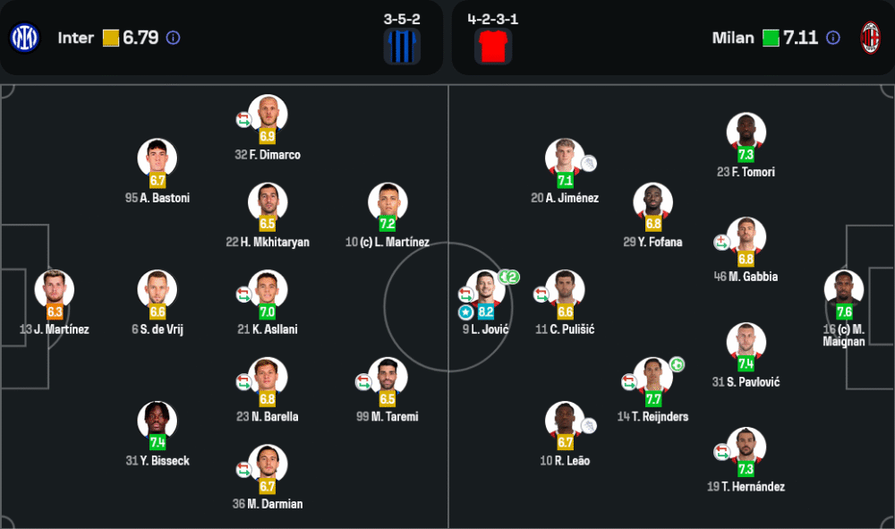 ผู้เล่นยอดเยี่ยมประจำแมตช์คือ ลูก้า โยวิช ดาวยิงชาวเซอร์เบียของเอซี มิลาน ที่ระเบิดฟอร์มซัดสองประตูสำคัญในนาทีที่ 36 และ 49 ทำให้เกมพลิกจากความอึดอัดกลายเป็นงานง่ายในครึ่งหลัง ด้วยคะแนน 8.2 ถือว่าเป็นผลงานที่สมบูรณ์แบบในเกมดาร์บี้แมตช์สุดเดือด