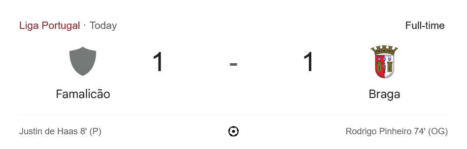 - ⚽ 74’ [1-1] โรดริโก ปินเญโร (ฟามาลิเคา) ทำเข้าประตูตัวเอง