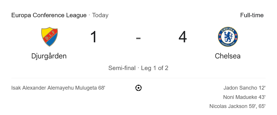 แม้จะเป็นถ้วยยุโรปที่ไม่ได้อยู่ในระบบลีก แต่ชัยชนะเกมนี้ทำให้เชลซีถือไพ่เหนือกว่าก่อนกลับไปเล่นในสแตมฟอร์ด บริดจ์ ในนัดที่สอง พวกเขามีโอกาสสูงมากที่จะผ่านเข้าสู่รอบชิงชนะเลิศ ขณะที่เยอร์การ์เด้นต้องไปเยือนด้วยสถานการณ์หลังพิงฝา ต้องยิงถึง 4 ลูกเพื่อหวังต่อเวลา