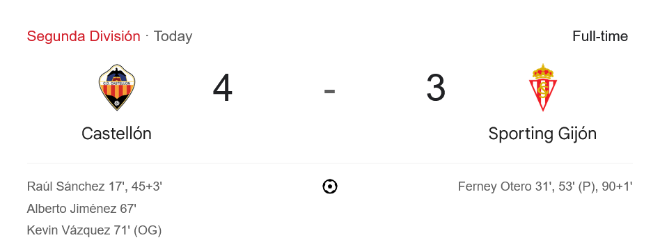 ชัยชนะนัดนี้ส่งผลให้คาสเตลล่อนเก็บเพิ่มเป็น 49 คะแนนจาก 38 นัด รั้งอันดับ 16 ของตารางแบบหวุดหวิด ห่างโซนตกชั้นเพียง 2 คะแนน ส่วนสปอร์ติ้ง กิฆอนมีอยู่ 47 คะแนน อยู่อันดับ 17 ยังต้องดิ้นรนหนักในอีก 4 เกมที่เหลือเพื่อลุ้นอยู่รอดในเซกุนด้า ดิวิชั่น ฤดูกาลหน้า