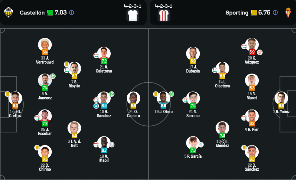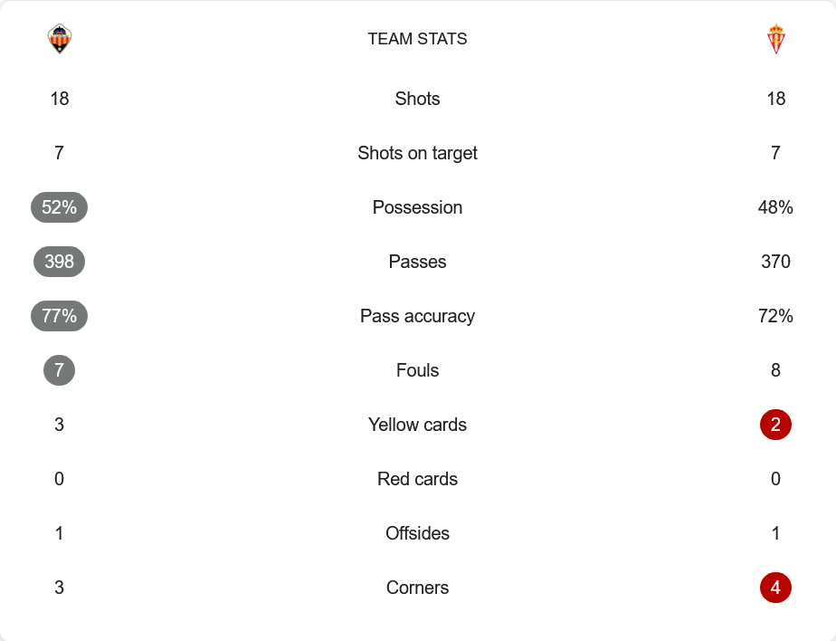 เกมนี้ทั้งสองทีมต่างมีโอกาสยิงเท่ากันที่ 18 ครั้ง และยิงตรงกรอบฝั่งละ 7 ครั้งเช่นกัน คาสเตลล่อนครองบอลได้ 52% เหนือกว่านิดหน่อย จ่ายบอลทั้งหมด 398 ครั้งด้วยความแม่นยำ 77% ขณะที่กิฆอนจ่ายบอล 370 ครั้ง ความแม่นยำอยู่ที่ 72% ทั้งสองทีมมีโอกาสบุกใกล้เคียงกันแต่ต่างกันที่จังหวะสุดท้าย คาสเตลล่อนได้เตะมุม 3 ครั้ง ส่วนกิฆอน 4 ครั้ง ใบเหลืองคาสเตลล่อน 3 ใบ ส่วนกิฆอนได้ไป 2 ใบ ฟาวล์ใกล้เคียงกันเช่นกัน
