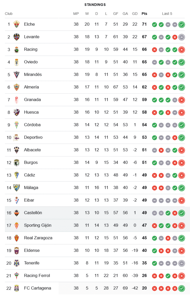 ใน ตารางบอล นัดถัดไป คาสเตลล่อนจะบุกเยือนมิรานเดสในวันที่ 10 พฤษภาคม เวลา 21:15 น. ส่วนสปอร์ติ้ง กิฆอนมีคิวเปิดบ้านรับการมาเยือนของเดปอร์ติโบ ลา กอรุนญ่าในวันเดียวกัน เวลา 21:15 น. ซึ่งทั้งสองแมตช์นี้ล้วนสำคัญต่อโอกาสรอดตกชั้นโดยตรง