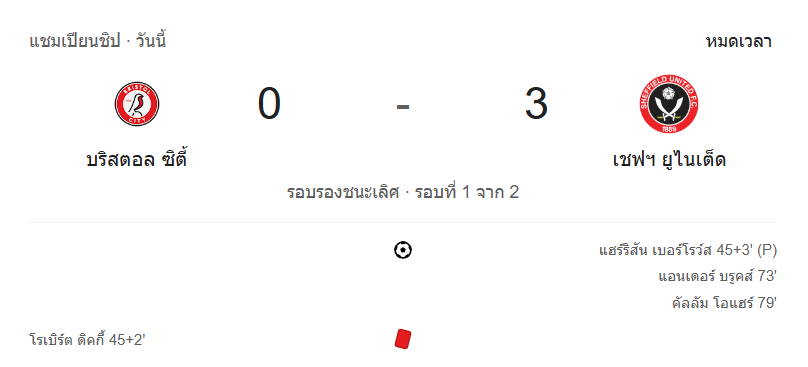 เกมนี้สะท้อนชัดว่า บริสตอล ซิตี้ เสียรูปเกมตั้งแต่ครึ่งแรกโดยเฉพาะจังหวะใบแดงของ Dickie ที่พลิกโมเมนตัมทั้งเกม ขณะที่ เชฟฟีลด์ ยูไนเต็ด ใช้ความได้เปรียบจำนวนผู้เล่นและความเฉียบคมปิดบัญชีแบบไม่ไว้หน้า สามประตูพร้อมใบแดงสะท้อนความต่างของสองทีม ซึ่ง ผลบอลสด 0-3 นี้ทำให้บริสตอลต้องปาฏิหาริย์เท่านั้นในเลกสอง
