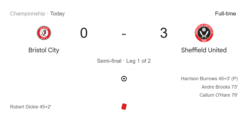 ชัยชนะ 3-0 ของเชฟฟีลด์ ยูไนเต็ด ในเกมเพลย์ออฟเลกแรกนี้ทำให้พวกเขากุมความได้เปรียบมหาศาลก่อนจะกลับไปเล่นนัดที่สองในบ้าน โดยไม่เสียอเวย์โกลแม้แต่ลูกเดียว ขณะที่บริสตอล ซิตี้ ต้องพบกับภารกิจสุดโหด หากหวังจะพลิกสถานการณ์ในเลกสอง
