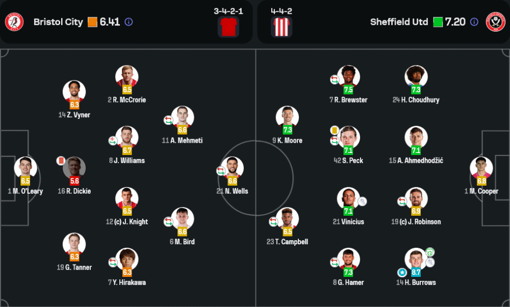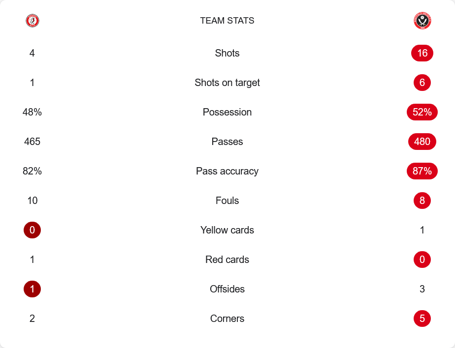 แม้เปอร์เซ็นต์การครองบอลจะใกล้เคียงกัน โดยบริสตอล ซิตี้ ครองบอล 48% ส่วนเชฟฟีลด์ ยูไนเต็ด อยู่ที่ 52% แต่โอกาสยิงนั้นห่างกันคนละชั้น เจ้าบ้านยิงเพียง 4 ครั้ง เข้ากรอบแค่ 1 ส่วนทีมเยือนกดไปถึง 16 ครั้ง เข้ากรอบ 6 โอกาส การจ่ายบอลของเชฟฟีลด์แม่นยำถึง 87% เทียบกับ 82% ของเจ้าถิ่น และที่สำคัญคือบรูว์สเตอร์และเบอร์โรวส์มีส่วนร่วมกับประตูทั้งหมด ขณะที่บริสตอลไม่มีมุมหวังยิงเลยในครึ่งหลัง