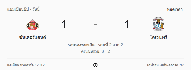 ซันเดอร์แลนด์ แสดงให้เห็นถึงหัวจิตหัวใจของทีมที่ไม่ยอมแพ้ แม้ตกเป็นฝ่ายตามหลัง แต่กลับมายิงในช่วงต่อเวลานาที 122 ได้สำเร็จ ส่วน โคเวนทรี ซิตี้ เองก็เล่นได้อย่างน่าชื่นชม แต่สุดท้ายต้องยอมรับชะตา ตกรอบไปด้วยหัวใจที่สู้สุดทาง