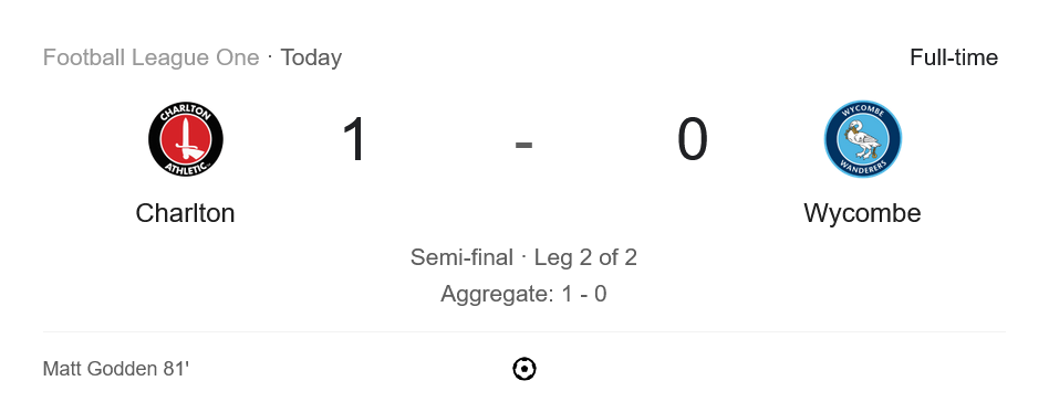 แมตช์นี้เป็นรอบรองชนะเลิศ เพลย์ออฟเลกสอง ของศึกลีกวัน ซึ่งหลังจากเสมอกันในเลกแรก 0-0 เกมนี้ชาร์ลตันคว้าชัย 1-0 รวมผลสองนัดเข้ารอบชิงชนะเลิศด้วยสกอร์รวม 1-0 ถือเป็นก้าวสำคัญในการลุ้นเลื่อนชั้นสู่แชมเปี้ยนชิพฤดูกาลหน้า ส่วนวีคอมบ์ต้องอกหักอย่างน่าเสียดาย