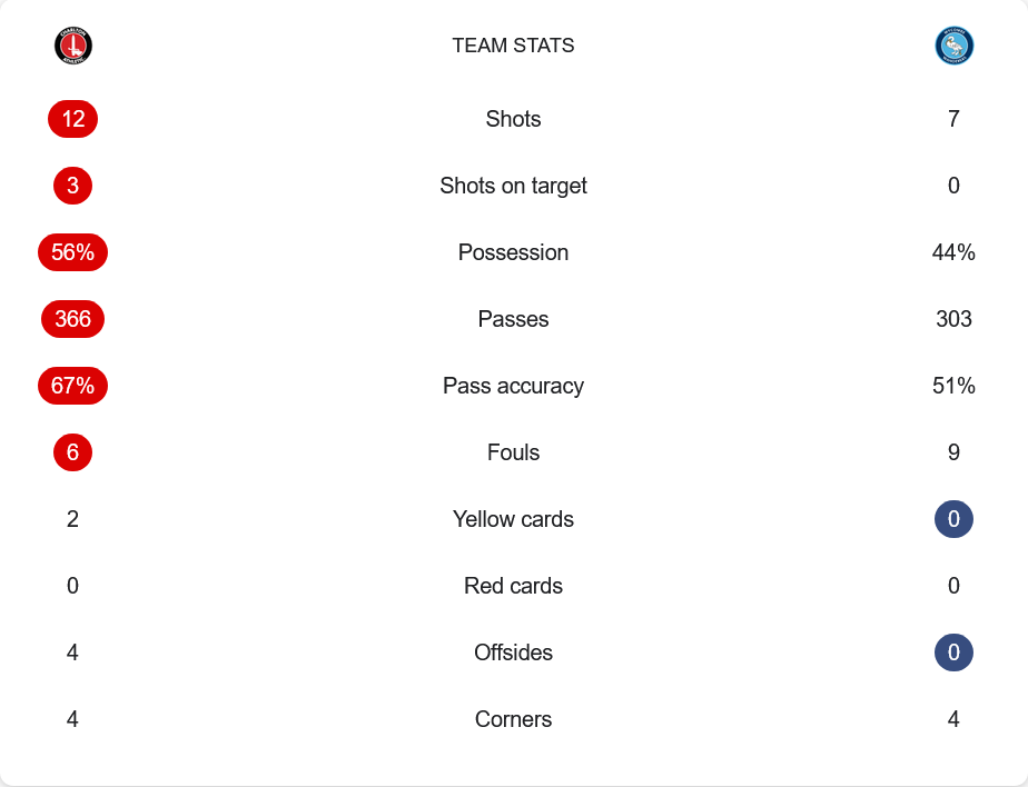 แม้ชาร์ลตันจะครองบอลได้มากกว่าเพียงเล็กน้อยที่ 56% แต่พวกเขาทำได้ดีกว่าในด้านประสิทธิภาพการเข้าทำ มีโอกาสยิงทั้งหมด 12 ครั้ง เข้ากรอบ 3 ครั้ง เทียบกับวีคอมบ์ที่ยิงไป 7 ครั้งแต่เข้ากรอบ 0 ครั้ง แสดงให้เห็นถึงความห่างกันในเกมรุกอย่างชัดเจน การผ่านบอลของเจ้าถิ่นก็ดีกว่าที่ 366 ครั้งด้วยความแม่นยำ 67% ขณะที่ทีมเยือนจ่ายบอลไป 303 ครั้ง ความแม่นยำเพียง 51% เกมนี้ ชาร์ลตันยังโดนฟาวล์น้อยกว่าที่ 6 ครั้ง และได้เตะมุมเท่ากันที่ 4 ครั้ง