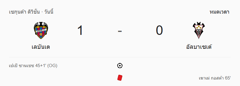 เลบันเต้ เปิดบ้านเฉือน อัลบาเซเต้ สุดเดือด 1-0 จากประตูสุดช็อก “OG” (ทำเข้าประตูตัวเอง) ของ เปเป้ ซานเชซ ช่วงทดเจ็บครึ่งแรก นาที 45+1 ก่อนทีมเยือนต้องเหลือ 10 คน เมื่อ ฆาเม่ กอสต้า โดนใบแดงนาที 65 ส่งค้างคาวน้อยแซงนำจ่าฝูง! แฟน “ผลบอลสด” ลุ้นกันวินาทีต่อวินาทีในเกมที่เต็มไปด้วยจังหวะสำคัญแบบห้ามกระพริบตา