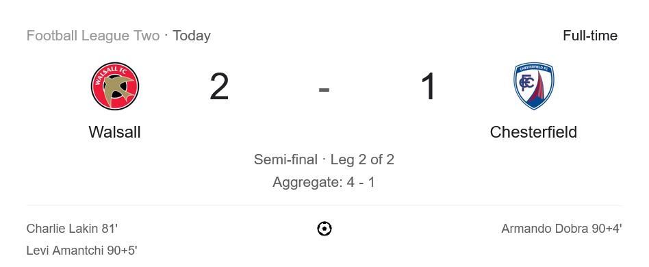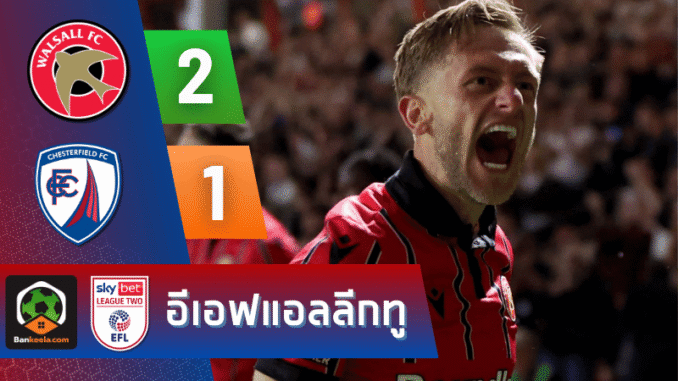 การแข่งขันฟุตบอล อีเอฟแอล ลีกทู เพลย์ออฟรอบรองชนะเลิศนัดที่ 2 ระหว่าง วอลซอลล์ เปิดบ้านรับมือ เชสเตอร์ฟิลด์ จบลงด้วยชัยชนะของเจ้าถิ่นที่บดเอาชนะไปได้ 2-1 รวมผลสองนัดชนะขาด 4-1 ตีตั๋วผ่านเข้าสู่รอบชิงชนะเลิศแบบสมศักดิ์ศรี โดยเกมนี้เกิดขึ้นอย่างดุเดือดในช่วงท้ายที่มีถึงสามประตูในช่วง 10 นาทีสุดท้าย ซึ่ง บ้านกีฬา ขอพาผู้อ่านไล่เรียงทุกจังหวะร้อนแรง พร้อมเสิร์ฟ ผลบอลสด และบทวิเคราะห์ครบทุกมุมสนาม
