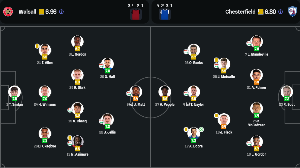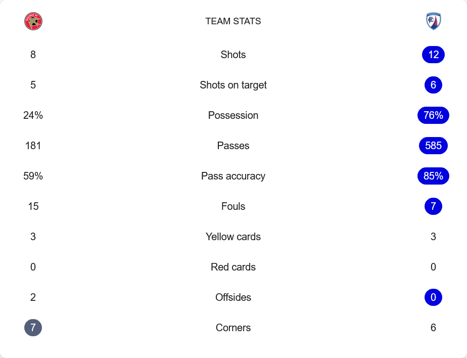 เกมนี้เชสเตอร์ฟิลด์ครองบอลเหนือกว่าชัดเจนที่ 76% เทียบกับวอลซอลล์เพียง 24% และผ่านบอลมากถึง 585 ครั้งเทียบกับ 181 ครั้งของเจ้าบ้าน พร้อมความแม่นยำที่ 85% ต่อ 59% แต่ในแง่ของโอกาสจบสกอร์ ทั้งสองทีมไม่ห่างกันมากนัก วอลซอลล์ยิง 8 ครั้ง เข้ากรอบ 5 ส่วนเชสเตอร์ฟิลด์ยิง 12 เข้ากรอบ 6 ทว่าประตูสำคัญกลับเป็นของเจ้าถิ่นที่จบได้คมกว่า แม้วอลซอลล์จะเสียฟาวล์ถึง 15 ครั้งและโดนใบเหลือง 3 ใบ แต่ยังควบคุมสถานการณ์ในสนามได้ดี ขณะที่เชสเตอร์ฟิลด์แม้เสียฟาวล์น้อยกว่าแต่กลับไม่มีการเปลี่ยนรูปแบบการเข้าทำในยามจำเป็น
