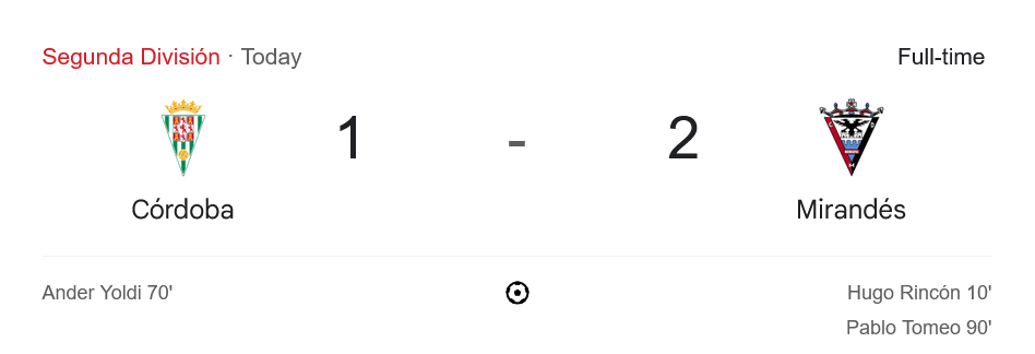 ชัยชนะนัดนี้ส่งให้ มิรานเดส ขยับแต้มขึ้นมาที่ 71 คะแนนจาก 40 นัด รั้งอันดับ 2 ของตาราง เซกุนด้า ดิวิชั่น มีลุ้นเลื่อนชั้นสู่ลาลีกาเต็มตัวในช่วง 2 นัดสุดท้าย ด้านคอร์โดบ้ายังอยู่ที่ 10 มี 54 คะแนน โอกาสลุ้นพื้นที่เพลย์ออฟเลื่อนชั้นเริ่มริบหรี่หลังปราชัยในบ้านตัวเอง บ้านผลบอล ต้องติดตามกันอย่างใกล้ชิดว่าฤดูกาลนี้จะจบลงอย่างไร