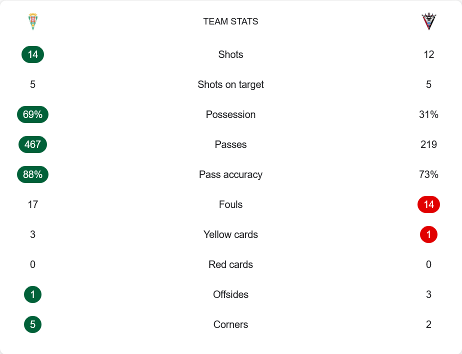 เกมนี้คอร์โดบ้าเดินเกมรุกด้วยการครองบอลถึง 69% ตลอด 90 นาที มีโอกาสยิงทั้งหมด 14 ครั้ง เข้ากรอบ 5 ครั้ง ในขณะที่มิรานเดสแม้จะครองบอลเพียง 31% แต่ตอบโต้ด้วยการยิง 12 ครั้ง เข้ากรอบ 5 เช่นกัน การผ่านบอลคอร์โดบ้าอยู่ที่ 467 ครั้ง แม่นยำถึง 88% ส่วนมิรานเดส 219 ครั้ง แม่นยำ 73% เกมนี้มีการฟาวล์รวมกันสูงถึง 31 ครั้ง และมีใบเหลืองเกิดขึ้น 4 ใบ การเล่นที่หนักแน่นและบีบพื้นที่กันเต็มที่ทำให้รูปเกมออกมาสูสีแม้สถิติการครองบอลจะต่างกันพอสมควร คอร์เนอร์คอร์โดบ้ามากกว่า 5 ต่อ 2 แต่จังหวะสุดท้ายทีมเยือนทำได้คมกว่า