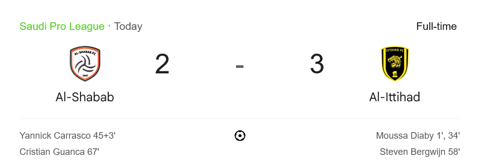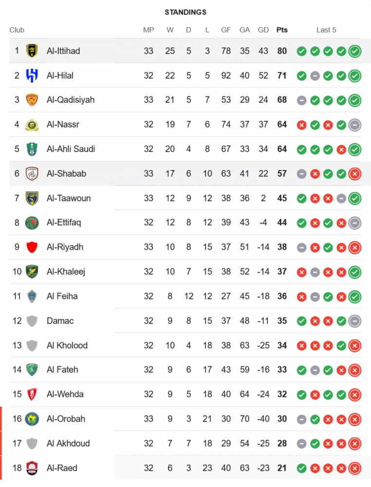 ชัยชนะนัดนี้ทำให้ อัล-อิติฮัด เก็บเพิ่มเป็น 80 คะแนนจาก 33 นัด รั้งตำแหน่งจ่าฝูงอย่างแข็งแกร่ง ทิ้งห่างอันดับสองอย่าง อัล-ฮิลาล ที่มี 71 คะแนนอยู่ 9 แต้ม ขณะที่ อัล-ชาบับ แพ้เกมนี้ยังคงมี 57 คะแนนจาก 33 นัด รั้งอันดับ 6 ของตาราง มีโอกาสไต่อันดับน้อยลงเรื่อย ๆ