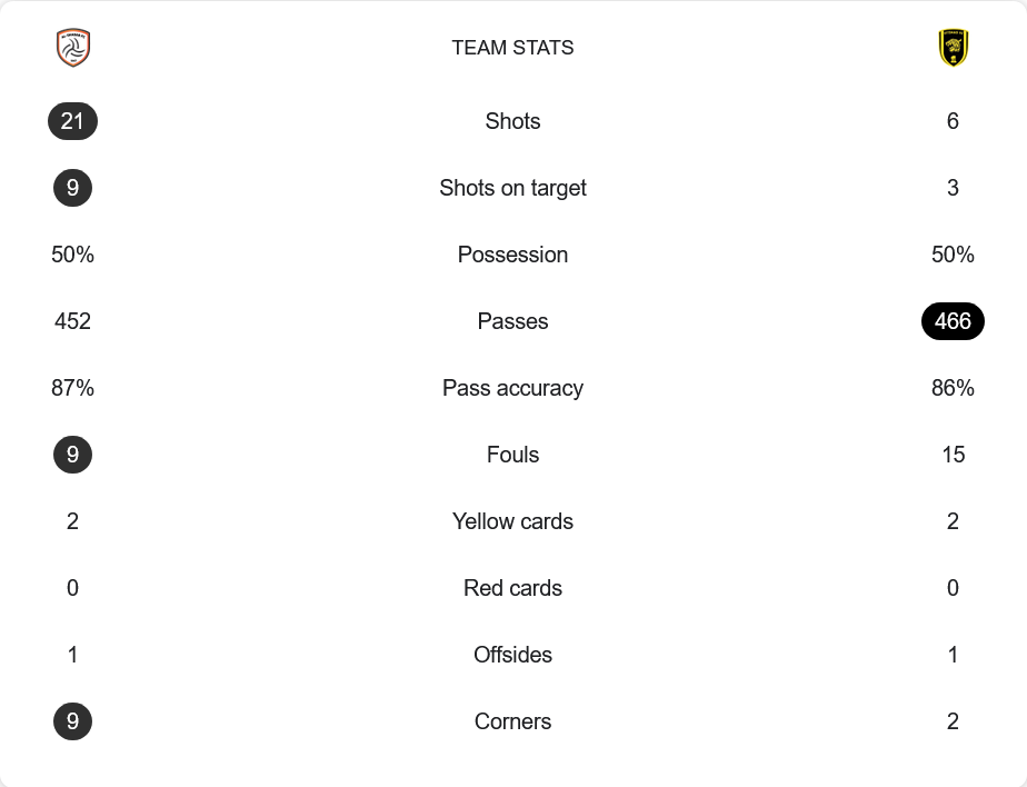 แม้จำนวนการครองบอลจะอยู่ที่ 50% ทั้งสองทีมเท่ากัน แต่ อัล-ชาบับ มีโอกาสยิงมากถึง 21 ครั้ง และเข้ากรอบ 9 ครั้ง ขณะที่ อัล-อิติฮัด ยิงเพียง 6 ครั้ง และเข้ากรอบ 3 ครั้ง แต่ทำได้ถึง 3 ประตู สะท้อนถึงความเฉียบคมในการจบสกอร์อย่างชัดเจน ในด้านของการจ่ายบอล อัล-อิติฮัดจ่ายบอล 466 ครั้งด้วยความแม่นยำ 86% ส่วนอัล-ชาบับจ่าย 452 ครั้งด้วยความแม่นยำ 87% โดยรวมถือว่าสูสี แต่ทีมเยือนมีประสิทธิภาพในพื้นที่สุดท้ายที่เฉียบขาดกว่า