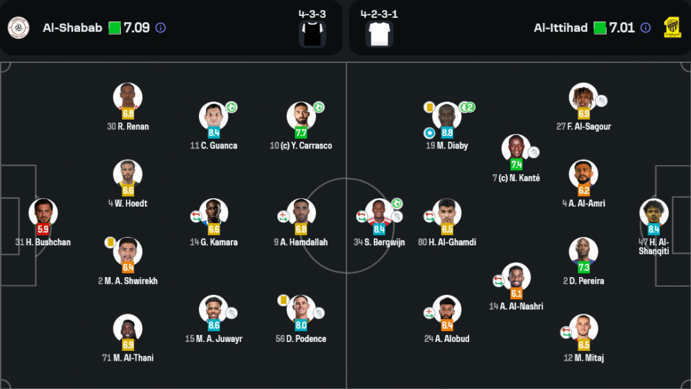 เริ่มเกมมาได้แค่ 1 นาที อัล-อิติฮัดก็ขึ้นนำ 1-0 อย่างสายฟ้าแลบจากลูกยิงของ มูสซ่า ไดอาบี้ ที่หลุดไปกดเต็มข้อ และนาที 34 ไดอาบี้คนเดิมก็มาเติมชื่อบนสกอร์บอร์ดอีกครั้ง จากจังหวะหลุดเข้าไปยิงมุมแคบผ่านมือผู้รักษาประตู เจ้าถิ่นยังไม่ทันตั้งตัว ก็โดนนำห่าง 0-2