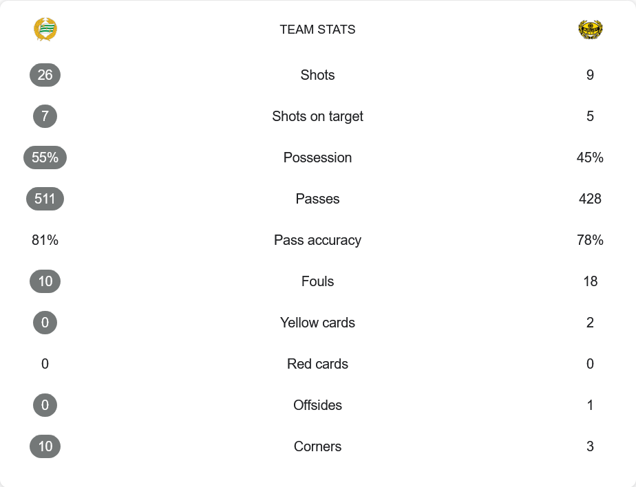 แม้ฮัมมาร์บี้จะมีโอกาสยิงมากถึง 26 ครั้ง เข้ากรอบ 7 แต่จบได้เพียงประตูเดียว ในขณะที่มอลล์บี้มีโอกาสเพียง 9 ครั้ง เข้ากรอบ 5 และเปลี่ยนเป็น 2 ประตูอย่างเฉียบขาด การครองบอลของเจ้าบ้านอยู่ที่ 55% เทียบกับทีมเยือน 45% ด้านการจ่ายบอล ฮัมมาร์บี้ทำได้ 511 ครั้ง ความแม่นยำ 81% ส่วนมอลล์บี้จ่าย 428 ครั้ง ความแม่นยำ 78% มอลล์บี้เสียฟาวล์มากถึง 18 ครั้ง และได้ใบเหลือง 2 ใบ ขณะที่เจ้าบ้านไม่มีใบเหลืองเลย แต่ก็ไม่สามารถใช้ประโยชน์จากการครองเกมได้
