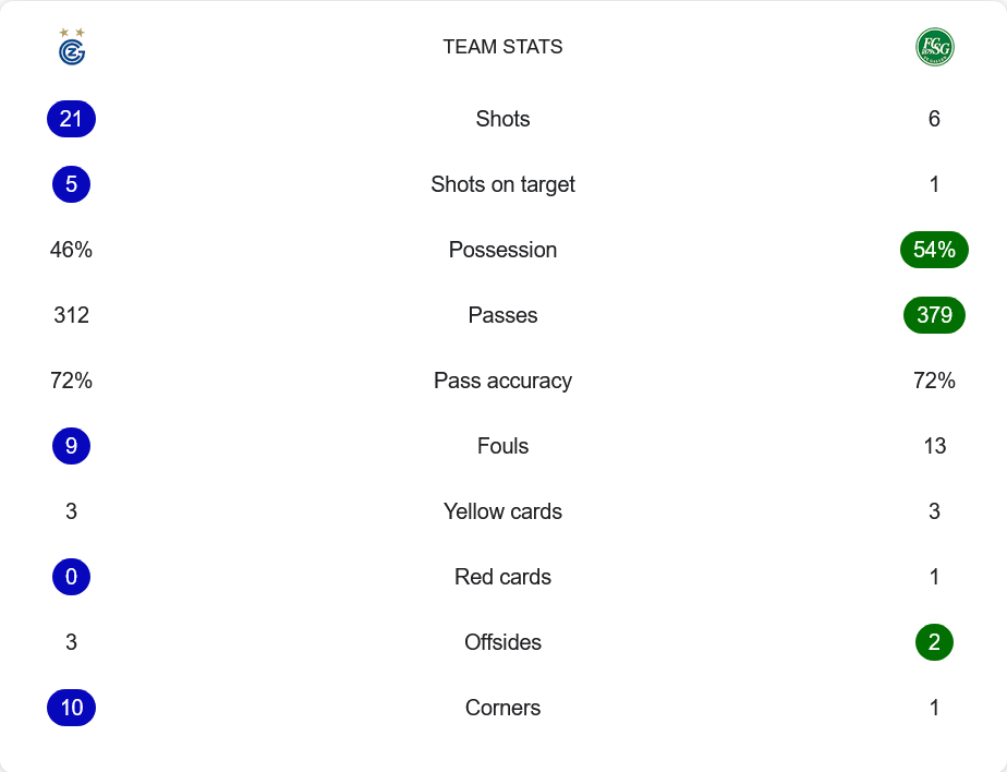 แม้กราสฮ็อปเปอร์จะครองบอลเพียง 46% แต่พวกเขากลับมีโอกาสยิงมากถึง 21 ครั้ง โดย 5 ครั้งเข้ากรอบ และได้เตะมุมถึง 10 หน ขณะที่เซนต์ กัลเลนครองบอล 54% จ่ายบอล 379 ครั้งเทียบกับเจ้าบ้าน 312 ครั้ง โดยทั้งสองทีมมีความแม่นยำในการจ่ายเท่ากันที่ 72% แต่สิ่งที่ต่างคือการจบสกอร์ โดยทีมเยือนยิงเพียง 6 ครั้ง และเข้ากรอบแค่หนเดียว นอกจากนี้พวกเขายังฟาวล์ถึง 13 ครั้ง เสียใบเหลือง 3 ใบ และโดนใบแดง 1 ใบ ส่วนกราสฮ็อปเปอร์ฟาวล์ 9 ครั้ง และไม่มีผู้เล่นถูกไล่ออก