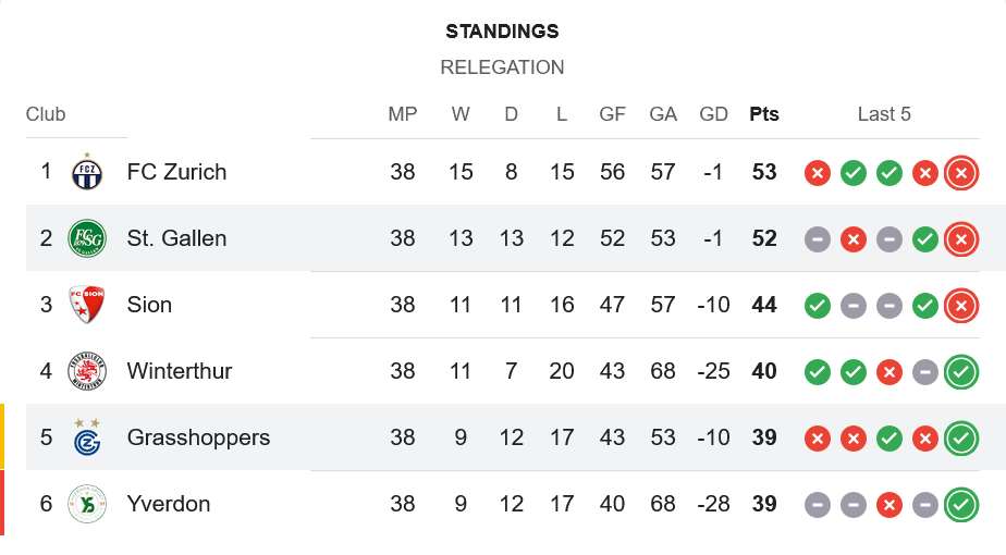 ชัยชนะในเกมนี้ของกราสฮ็อปเปอร์ทำให้พวกเขามีแต้มเท่ากับ เยเวอร์ดง ที่ 39 แต้ม จาก 38 นัด เท่ากันทุกประการ รวมทั้งประตูได้เสีย ส่งผลให้สถานการณ์ยังเปิดกว้างในการแย่งหนีโซนเพลย์ออฟตกชั้นต่อไป ขณะที่เซนต์ กัลเลนยังรั้งอันดับสองของกลุ่ม แต่สถานการณ์เริ่มสั่นคลอน หากพลาดอีกครั้งมีโอกาสโดนดูดลงมาร่วมวงอยู่รอดแบบเต็มตัว