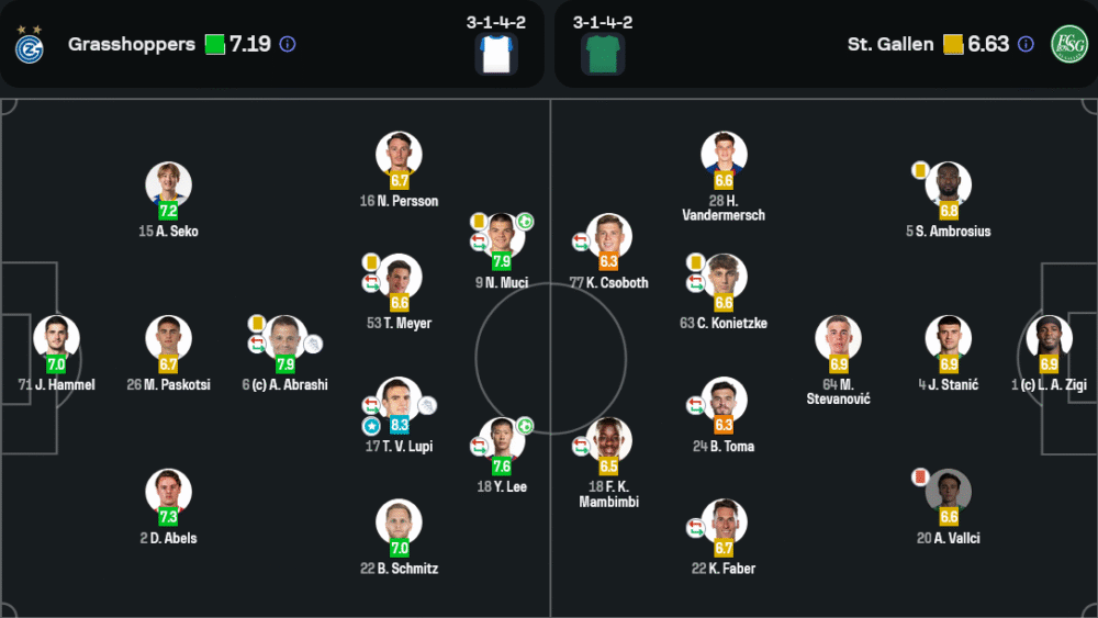 กราสฮ็อปเปอร์ เลือกใช้ระบบ 3-1-4-2 ที่เน้นการเข้าทำตรงกลางและเปิดพื้นที่ริมเส้นให้วิงแบ็คเติมได้อย่างอิสระ การประสานงานของ อบราชี่ กับ ลูปิ และ มูชี่ ถือเป็นหัวใจสำคัญในแนวรุก ที่สร้างสรรค์โอกาสได้ตลอดทั้งเกม แม้ครองบอลน้อยกว่าเพียง 46% แต่ยิงถึง 21 ครั้งและเข้ากรอบ 5 ครั้ง ยืนยันชัดว่าจังหวะสุดท้ายของพวกเขามีคุณภาพมากกว่า