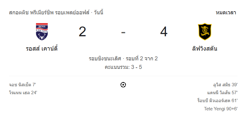 - นาทีที่ 90+6 (GOAL!): Tete Yengi (Livingston) ยิงปิดกล่อง 4-2
