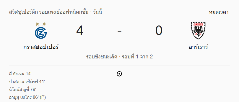 กราสส์ฮ็อปเปอร์ระเบิดฟอร์ม! ผลบอลสด กราสส์ฮ็อปเปอร์ 4-0 อาเรา เพลย์ออฟเลื่อนชั้น/ตกชั้นสวิส