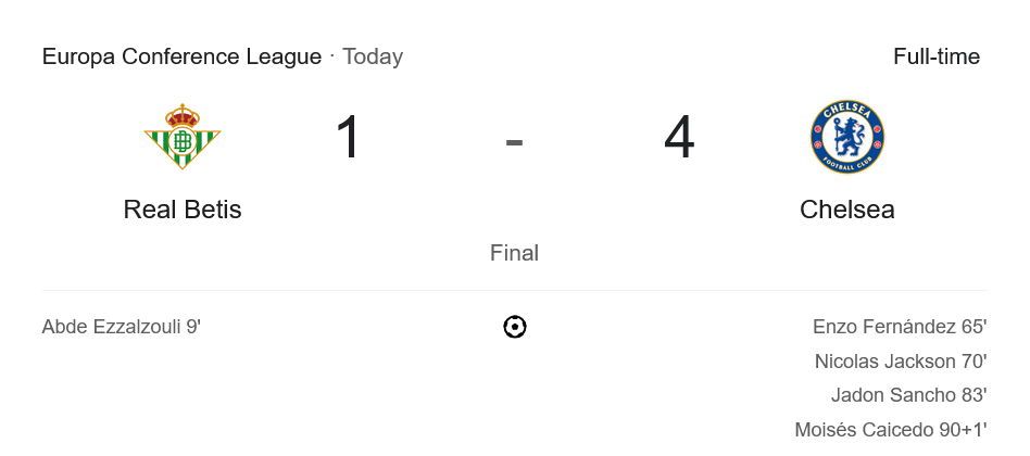 แม้จะไม่มีตารางคะแนนในเกมนี้เพราะเป็นเกมถ้วยยุโรป แต่ผลการแข่งขันสุดโหดนี้ตอกย้ำว่า เชลซี ภายใต้การคุมทีมของเอ็นโซ่ มาเรสก้า กำลังเดินมาถูกทาง และพร้อมท้าทายทุกถ้วยที่เหลือในฤดูกาลนี้ ขณะที่ เรอัล เบติส สะกดคำว่าชนะไม่เจอมาแล้ว 5 นัดติด รวมทุกรายการ ความพ่ายแพ้ในเกมนี้ส่งแรงกระเพื่อมต่อความมั่นใจของทีมอย่างหนัก