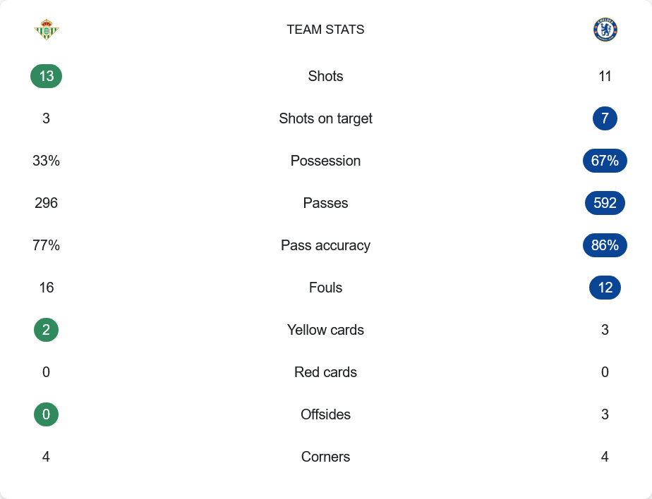 แม้จะยิงน้อยกว่า แต่เชลซีแสดงให้เห็นถึงประสิทธิภาพในการเข้าทำ ด้วยการยิงตรงกรอบถึง 7 ครั้งจาก 11 หน ซึ่งแปลงเป็น 4 ประตู ส่วนเบติสแม้จะมีโอกาสยิงถึง 13 ครั้งแต่ตรงกรอบแค่ 3 ครั้งเท่านั้น การครองบอลชัดเจนว่าอยู่ที่เชลซีถึง 67% และการผ่านบอลก็เหนือกว่ามากถึง 592 ครั้ง เทียบกับเบติสที่ทำได้เพียง 296 ครั้ง พร้อมความแม่นยำในการจ่ายที่ดีกว่าที่ 86% เทียบกับเจ้าบ้านที่มีเพียง 77% ทั้งสองฝ่ายมีใบเหลืองรวมกัน 5 ใบ และมีลูกเตะมุมฝั่งละ 4 ครั้ง