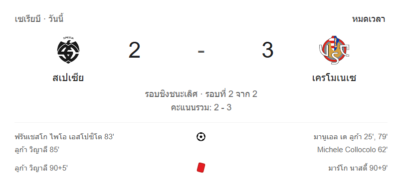 - หมดเวลาการแข่งขัน: สเปเซีย พลาดท่าคาบ้าน พ่าย เครโมเนเซ 2-3