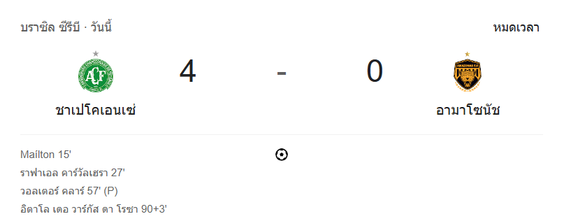 - หมดเวลาการแข่งขัน: ชาเปโคเอนเซ่ ถล่ม อมาโซนัส 4-0