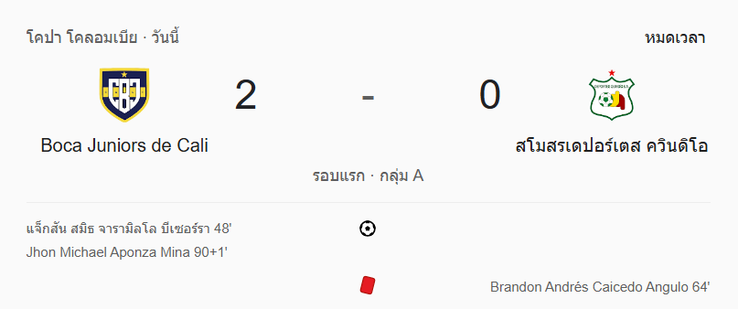 • นาทีที่ 90+4: จบเกม Boca Juniors de Cali ชนะ Sports Quindío 2-0