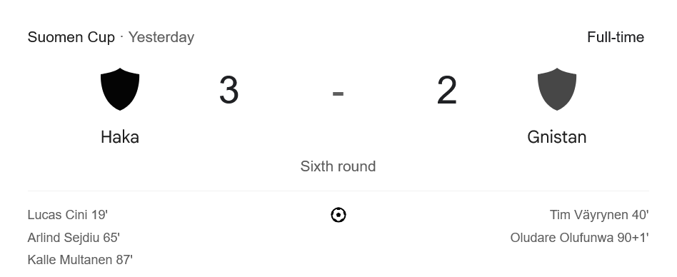 ศึกฟินแลนด์ คัพ 2025 รอบที่หก ระเบิดความมันเต็มพิกัดเมื่อวันที่ 11 มิถุนายนที่ผ่านมา โดยเจ้าถิ่น ฮาก้า เปิดรังรับการมาเยือนของ กนิสตัน เฮลซิงกิ ทีมแกร่งจากเวียกคุสลีกา และนี่คือเกมที่ดุเดือดตั้งแต่นาทีแรกจนวินาทีสุดท้าย ก่อนจบลงด้วยชัยชนะของฮาก้า 3-2 อย่างสุดมัน โดยตลอดเกมแฟนบอลต่างเกาะจอรอชม ผลบอลสด กันอย่างระทึกผ่าน บ้านกีฬา ที่เก็บครบทุกช็อตเดือด