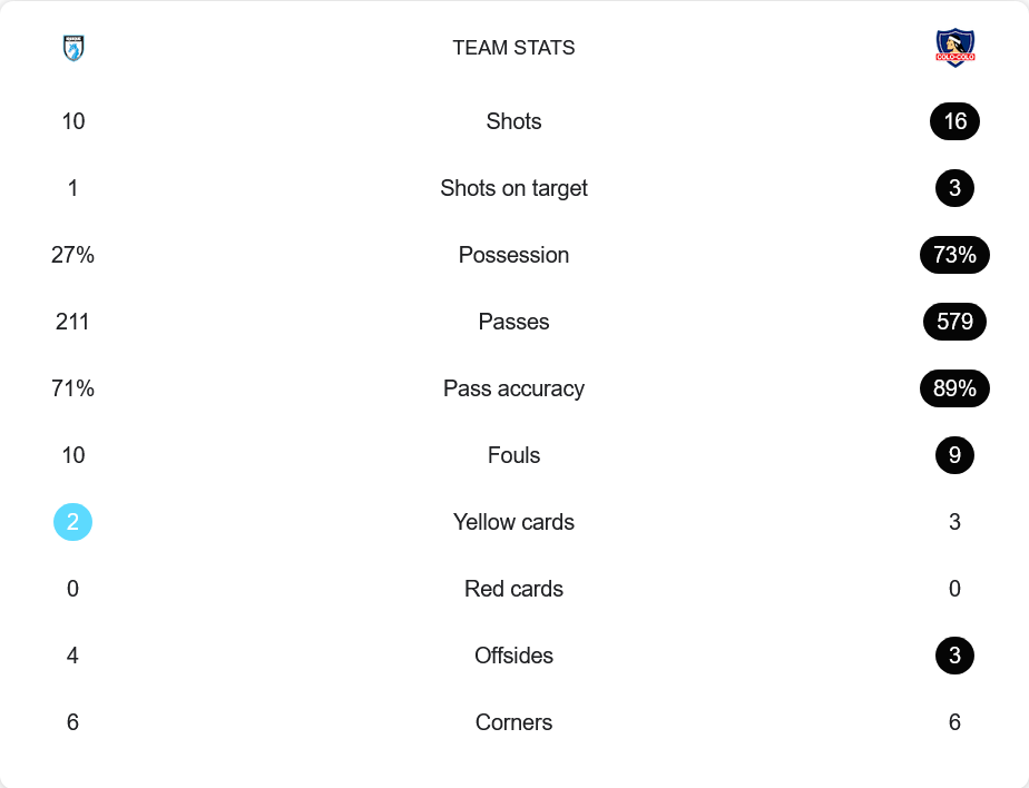 แม้ผลจะเสมอ 2-2 แต่หากดูจากสถิติ โคโล โคโล่ แทบจะครองเกมอยู่ฝ่ายเดียว พวกเขามีการครองบอลถึง 73% ผ่านบอลมากถึง 579 ครั้ง และมีความแม่นยำสูงถึง 89% ขณะที่เจ้าบ้านมีบอลแค่ 27% และผ่านบอลเพียง 211 ครั้งเท่านั้น โคโล โคโล่ ยิงทั้งหมด 16 ครั้ง เข้ากรอบ 3 ส่วนอิควิกกัวยิง 10 ครั้ง แต่เข้าเป้าเพียง 1 ครั้ง โคโล โคโล่ ได้เตะมุม 6 ครั้งเท่ากับเจ้าบ้าน ฟาวล์ใกล้เคียงกัน (9 ต่อ 10) ใบเหลืองเจ้าบ้านได้ 2 ใบ ส่วนทีมเยือนได้ 3 ใบ