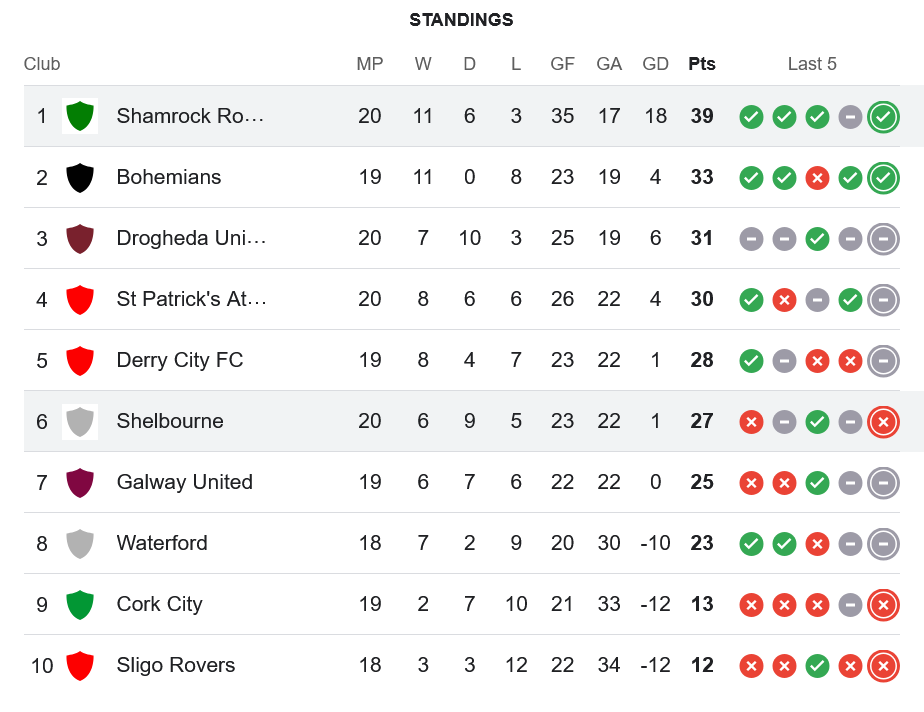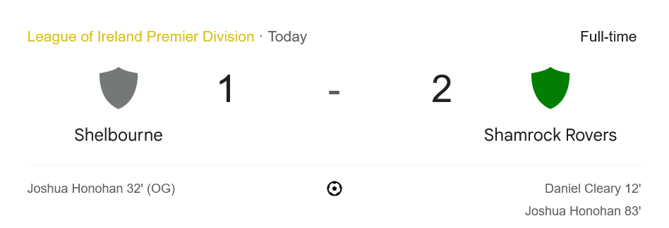 ชัยชนะในเกมนี้ทำให้แชมร็อค โรเวอร์สเก็บเพิ่มเป็น 39 แต้มจาก 20 นัด ยึดตำแหน่งจ่าฝูงแบบมั่นคง พร้อมทิ้งห่างโบฮีเมี่ยนส์ 6 แต้ม แม้แข่งมากกว่า 1 นัดก็ตาม ด้านเชลบอร์นสะดุดอีกครั้ง หล่นอยู่อันดับ 6 มี 27 แต้มจาก 20 เกม เสียจังหวะในการไล่ล่าท็อปโฟร์อย่างน่าเสียดาย