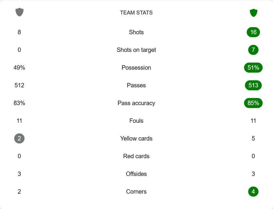 แม้เปอร์เซ็นต์การครองบอลจะใกล้เคียงกัน โดยแชมร็อค โรเวอร์สครองบอล 51% เทียบกับเชลบอร์น 49% แต่จำนวนการจ่ายบอลและความแม่นยำของทีมเยือนเหนือกว่าที่ 513 ครั้ง และความแม่นยำถึง 85% ขณะที่เชลบอร์นจ่าย 512 ครั้ง และแม่นยำ 83% ด้านโอกาสยิงถือว่าห่างชั้นกันชัดเจน เมื่อแชมร็อคยิงถึง 16 ครั้ง เข้ากรอบ 7 ครั้ง ส่วนเชลบอร์นยิง 8 ครั้งแต่ไม่ตรงกรอบเลย ฟาวล์เท่ากันที่ 11 ครั้ง ใบเหลืองฝั่งทีมเยือนโดนไปถึง 5 ใบ ขณะที่เจ้าบ้านโดน 2 ใบ