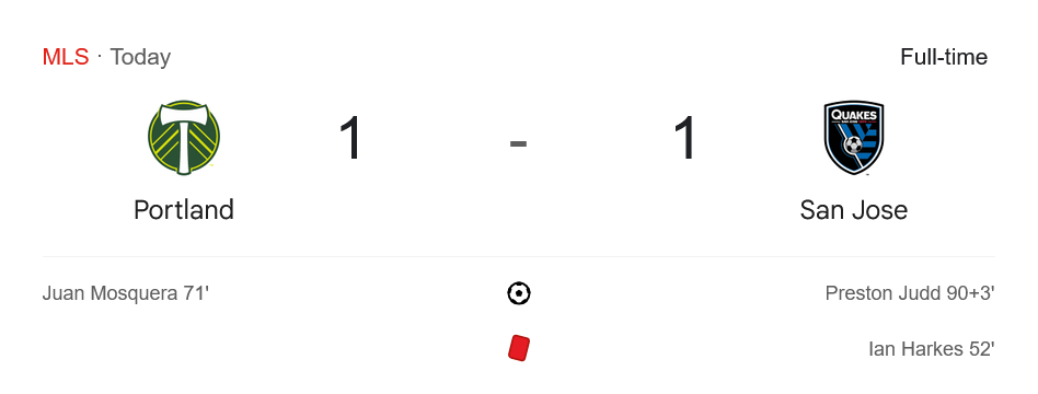 การแข่งขันฟุตบอลเมเจอร์ลีก ซอกเกอร์ (MLS) เมื่อช่วงเช้าตามเวลาไทยระหว่าง พอร์ทแลนด์ ทิมเบอร์ส เปิดบ้านรับมือ ซาน โฮเซ เอิร์ธเควกส์ จบลงด้วยผลเสมอ 1-1 สุดมัน โดยเกมนี้ต้องบอกว่าเต็มไปด้วยจังหวะดราม่า โดยเฉพาะในช่วงท้ายที่ทีมเยือนตามตีเสมอในนาที 90+3 แม้จะเหลือผู้เล่น 10 คนตั้งแต่นาที 52 ทำให้ ผลบอลสด จากเกมนี้ทิ้งความรู้สึกสุดมันให้แฟนบอลทั้งสองฝั่ง