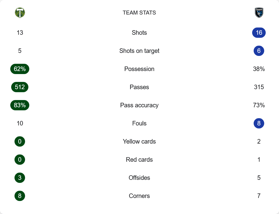เกมนี้พอร์ทแลนด์ ทิมเบอร์ส ครองบอลมากถึง 62% จ่ายบอล 512 ครั้ง ความแม่นยำ 83% ยิงทั้งหมด 13 ครั้ง เข้ากรอบ 5 ขณะที่ซาน โฮเซ ครองบอลแค่ 38% แต่ยิงได้มากกว่าที่ 16 ครั้ง เข้ากรอบ 6 โดยมีโอกาสจากจังหวะโต้กลับหลายหน ทั้งสองทีมมีจำนวนฟาวล์ใกล้เคียงกัน เจ้าบ้าน 10 ครั้ง ทีมเยือน 8 ครั้ง และซาน โฮเซมีใบเหลือง 2 ใบ ใบแดง 1 ใบ ขณะที่พอร์ทแลนด์ไม่มีใบใดเลย ทั้งสองทีมได้เตะมุมรวมกันถึง 15 ครั้ง และเป็นอีกเกมที่สถิติบ่งชี้ว่าแม้ครองบอลน้อยก็สามารถมีโอกาสทำประตูได้มากหากวางแผนดี