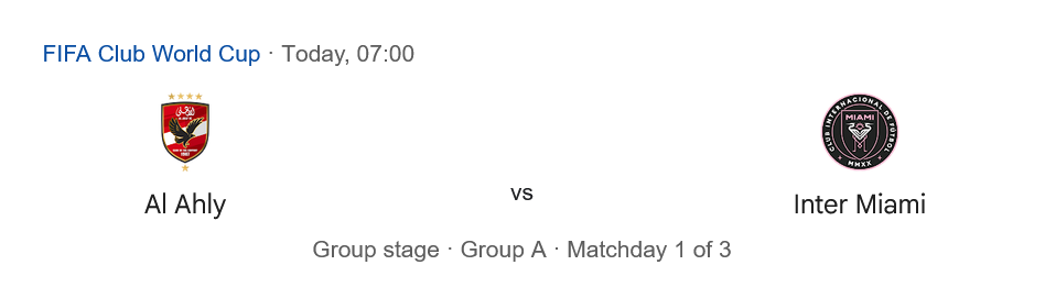 ใน ตารางบอล กลุ่ม A นัดต่อไป เอล อาห์ลี จะต้องเจองานหนัก พบกับ ปัลไมรัส ในวันที่ 19 มิถุนายน เวลา 23:00 น. ขณะที่ อินเตอร์ ไมอามี จะพบ ปอร์โต้ ในช่วงเช้ามืดวันที่ 20 มิถุนายน เวลา 02:00 น. ทั้งสองทีมยังมีโอกาสลุ้นผ่านเข้ารอบ ต้องมาวัดกันต่อในสองแมตช์สุดท้าย