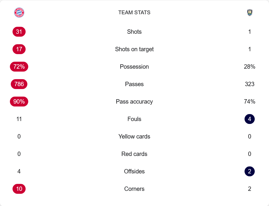 บาเยิร์นครองบอลเหนือกว่าชัดเจนที่ 72% เทียบกับ 28% ของโอ๊คแลนด์ ซิตี้ พร้อมสร้างโอกาสยิงถึง 31 ครั้ง โดยเข้ากรอบถึง 17 ครั้ง ขณะที่ทีมจากนิวซีแลนด์มีโอกาสยิงเพียงครั้งเดียวตลอด 90 นาที เสือใต้ผ่านบอลรวม 786 ครั้งด้วยความแม่นยำสูงถึง 90% ต่างจากโอ๊คแลนด์ที่จ่ายเพียง 323 ครั้งและความแม่นยำอยู่แค่ 74% ในเกมนี้ไม่มีใบเหลืองหรือใบแดงเกิดขึ้น แต่บาเยิร์นมีถึง 10 ลูกเตะมุม และล้ำหน้า 4 ครั้ง แสดงให้เห็นถึงความดุดันในการพยายามเข้าทำ