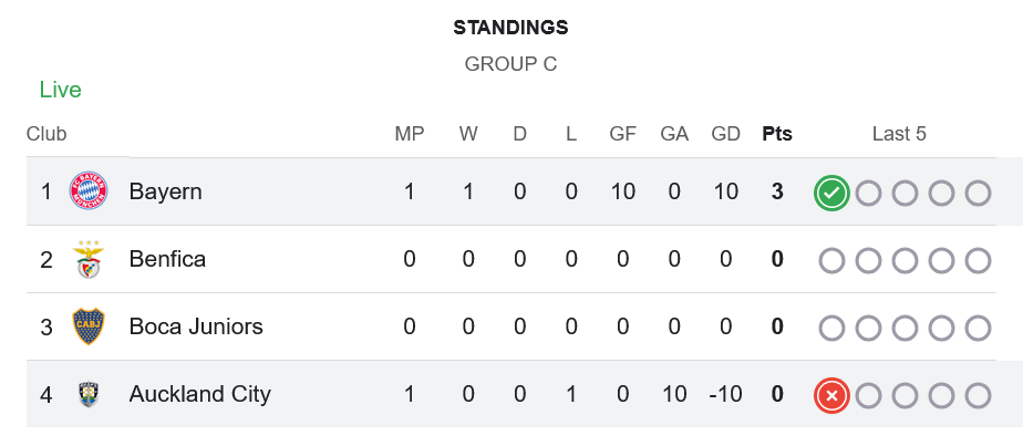 หลังจากเปิดหัวสุดโหด บาเยิร์นขึ้นนำจ่าฝูงของกลุ่ม C ด้วยผลงานชนะ 1 นัด ยิง 10 เสีย 0 ประตู เก็บ 3 แต้มพร้อมผลต่างประตูได้เสีย +10 แบบไม่ต้องลุ้นให้เหนื่อย ขณะที่โอ๊คแลนด์ ซิตี้ จมบ๊วยของกลุ่ม -10 ประตู ต้องเร่งฟอร์มในสองเกมที่เหลือกับเบนฟิก้าและโบคา จูเนียร์สหากยังหวังเข้ารอบ