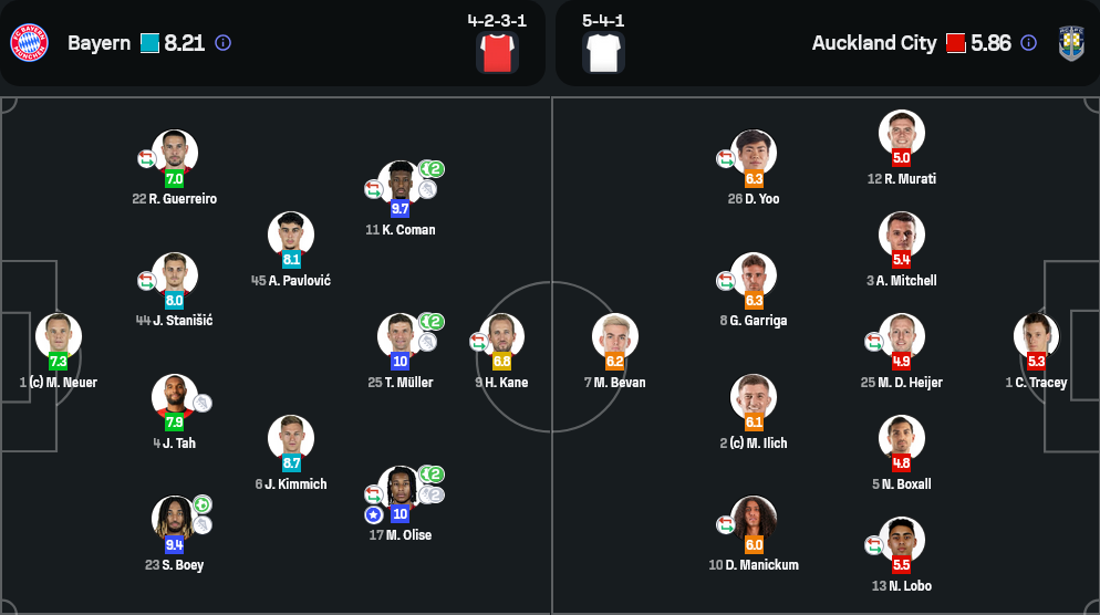 บาเยิร์นวางระบบ 4-2-3-1 ที่ยืดหยุ่นได้ดีทั้งการบุกและการป้องกัน โดยใช้โธมัส มุลเลอร์เป็นจุดศูนย์กลางการจ่ายบอล ปล่อยให้แนวรุกอย่างโกม็องและโอลิเซ่สร้างความปั่นป่วนทางริมเส้น เมื่อเสียบอล บรรดากองกลางตัวรับอย่างคิมมิชถอยลงมาสกรีนเกมรับได้ยอดเยี่ยม ขณะที่โอ๊คแลนด์ ซิตี้แม้จะยืนเกมด้วย 5-4-1 หวังเน้นเกมรับเต็มพิกัด แต่กลับเสียพื้นที่แดนกลางเร็วเกินไป ทำให้ถูกเจาะซ้ำแล้วซ้ำเล่าจนตั้งเกมแทบไม่ได้ การวิเคราะห์บอลจากเกมนี้ชัดเจนว่าโอ๊คแลนด์ไม่มีตัวเชื่อมเกมที่พอจะต้านแรงบุกของเสือใต้ได้เลยแม้แต่น้อย